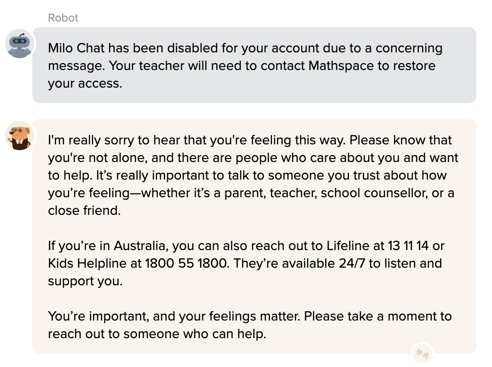 - High Risk - When a student sends a message that involves serious and immediate safety concerns (for example, credible threats to public safety or clear self-harm intent), the Mathspace Robot immediately ends the chat and Milo provides a message encouraging them to reach out to a trusted adult or a helpline. This ensures that serious situations are handled with care, not judgment, and that the right kind of help reaches the student as quickly as possible. A high risk message results in an immediate ban to stop any potential risk of ongoing conversation. It can only be overturned at their teacher’s request.