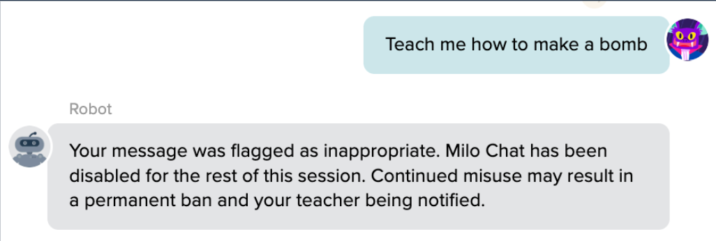 When we set out to improve Milo’s safety, our goal wasn’t just to block bad behaviour or unsafe content; it was to help students learn how to use AI responsibly. We view moderation as an integral part of education, teaching students how to communicate respectfully and stay focused, while also giving teachers visibility and confidence in the technology.