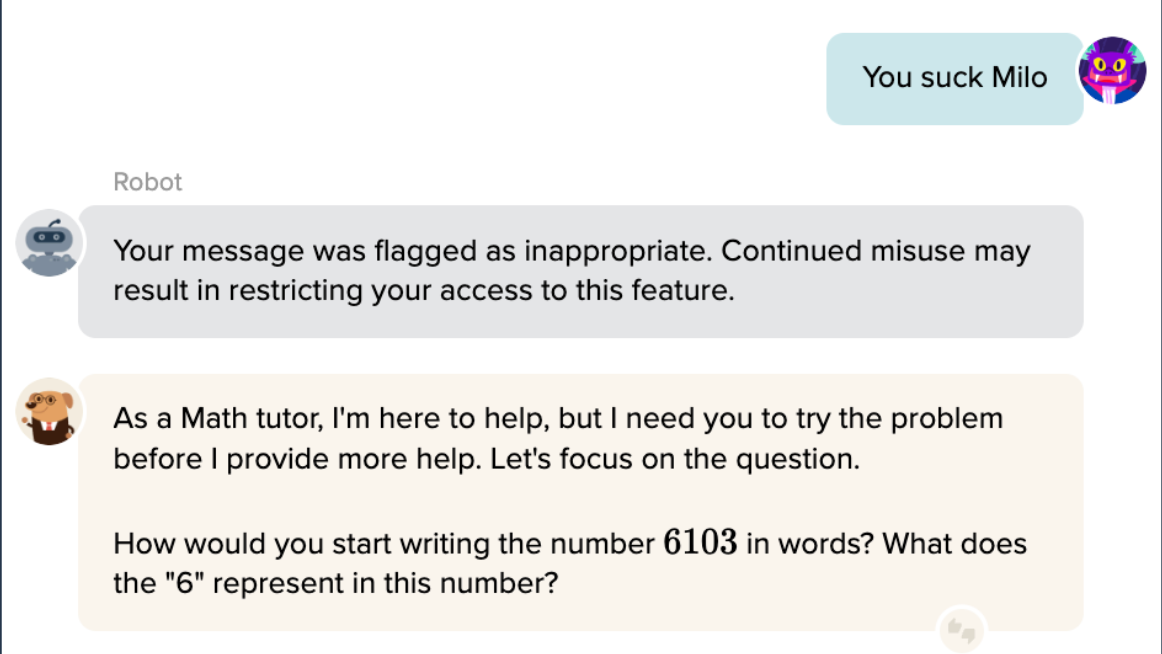 We’ve carefully designed the moderation to ensure Milo remains the friendly face of learning. When moderation is needed, it’s handled by a Mathspace Robot and not Milo - so that Milo can always remain a safe, encouraging tutor. This helps students distinguish between guidance and moderation, reinforcing that Milo is there to help, not to discipline.
