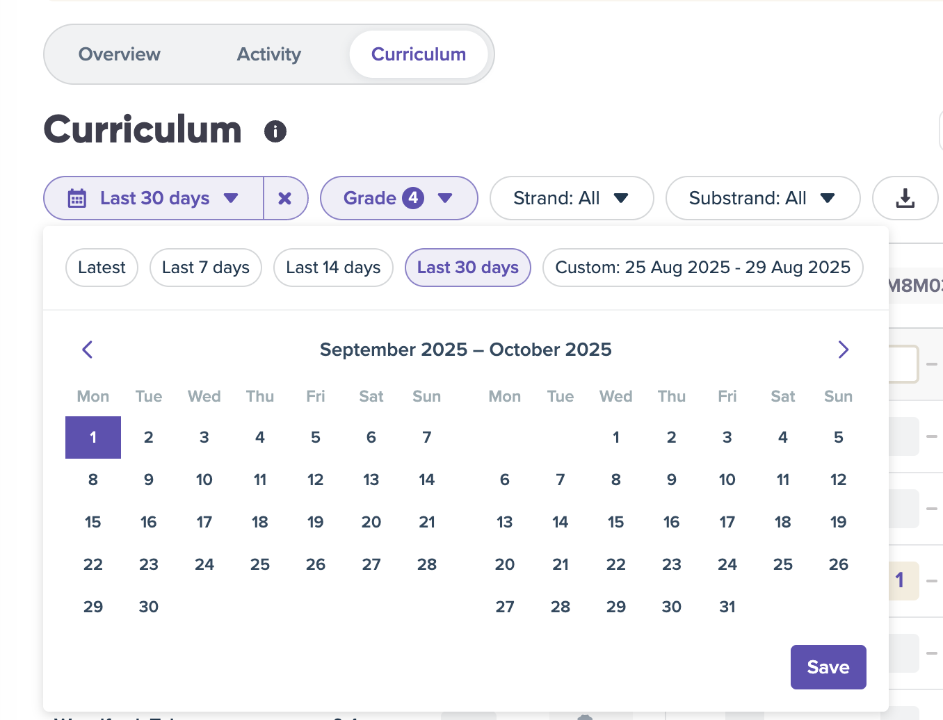 This means you can start with a bird’s-eye view of your class performance and then explore outcome-level detail. Whether you want to check progress across a term, review last week’s work, or track long-term growth, the new custom date filter makes it easy to focus on the timeframe that matters most.