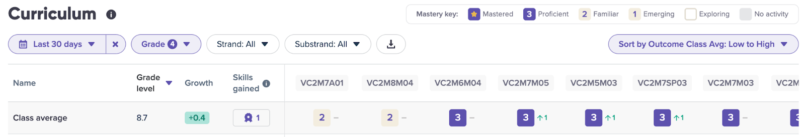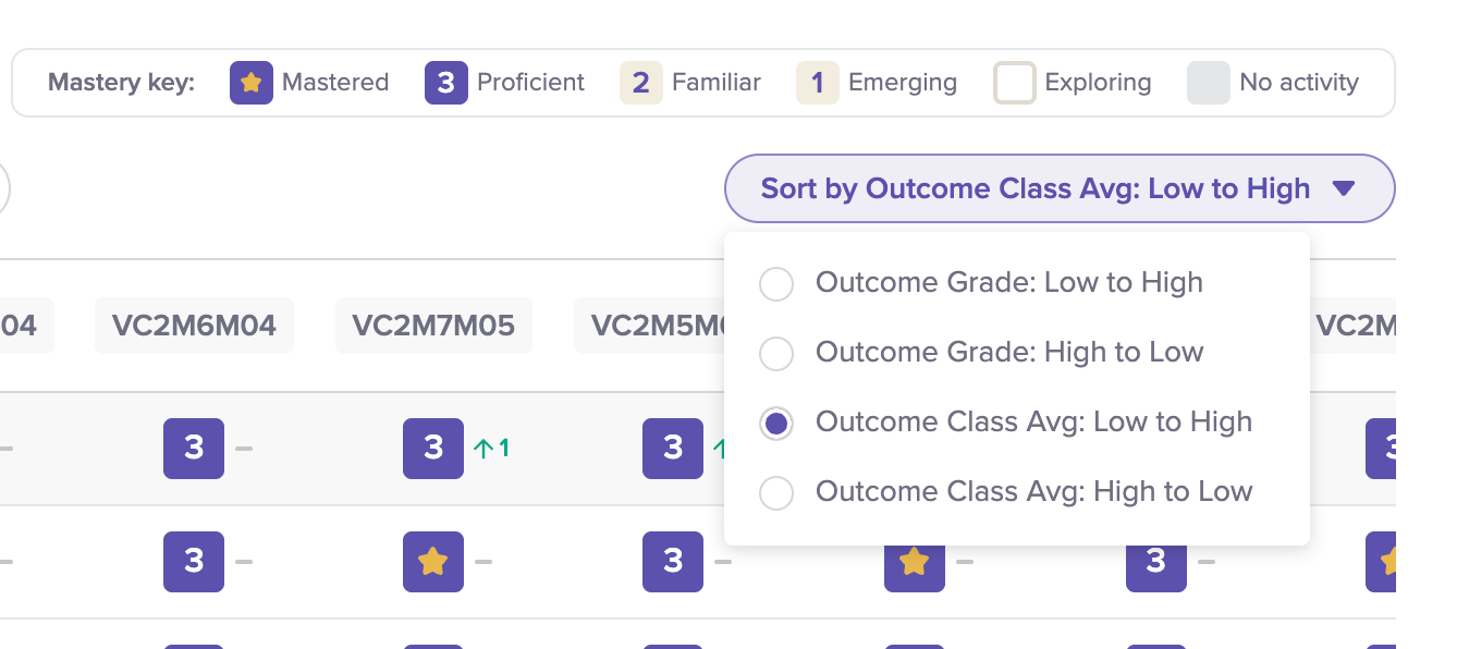 From there, you can sort curriculum outcomes by proficiency, so the outcomes where students are struggling most are grouped together. It’s a simple way to pinpoint gaps and plan targeted lessons.